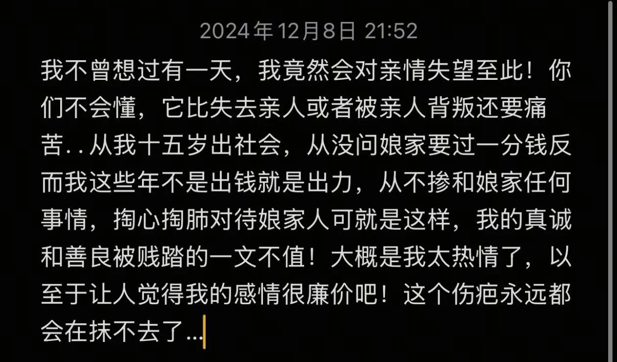 生活是现实的,而亲情有时候也没能帮助到她,这位妈妈在2024年12月份的时候发布了一段文字,称亲情让她失望,自己15岁走上社会,从来没找父母拿过一分钱,反而是为家里出钱出力,也不掺和娘家的事情。