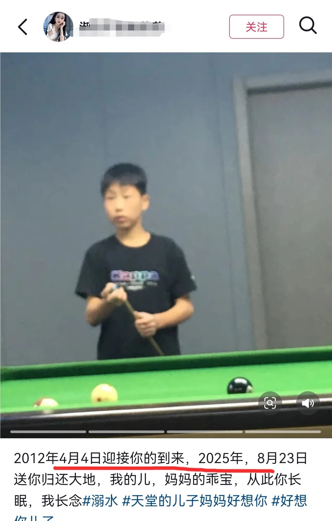 据妈妈透露,儿子出生于2012年4月,出事时才13岁,于8月23日去世,也就是说,在开学前一周孩子还好好的。